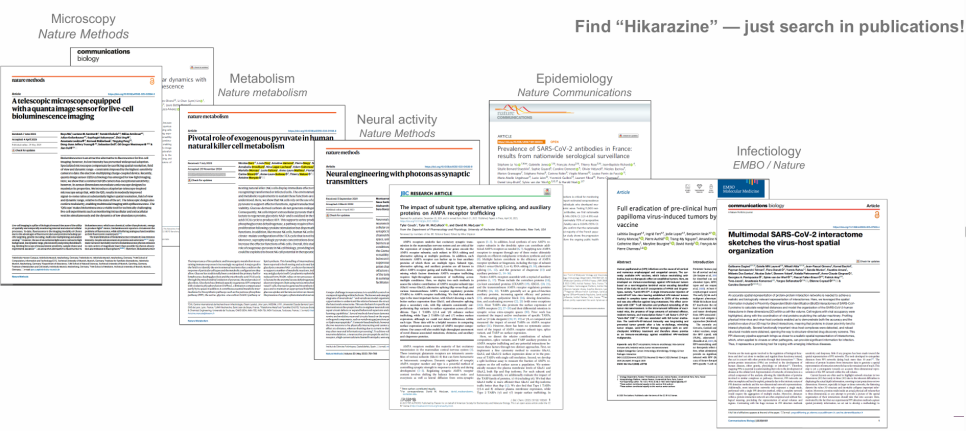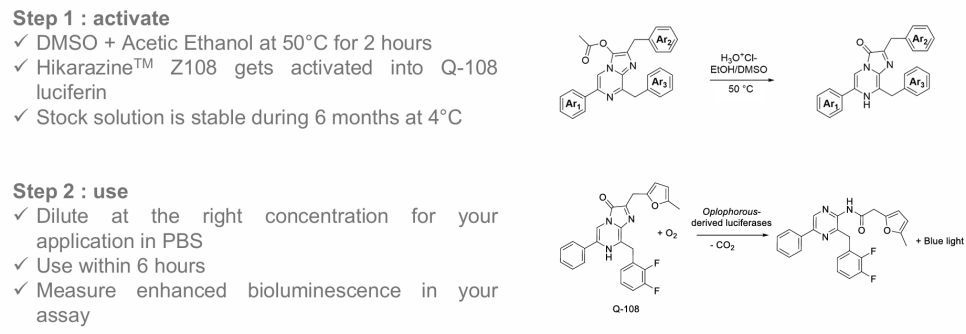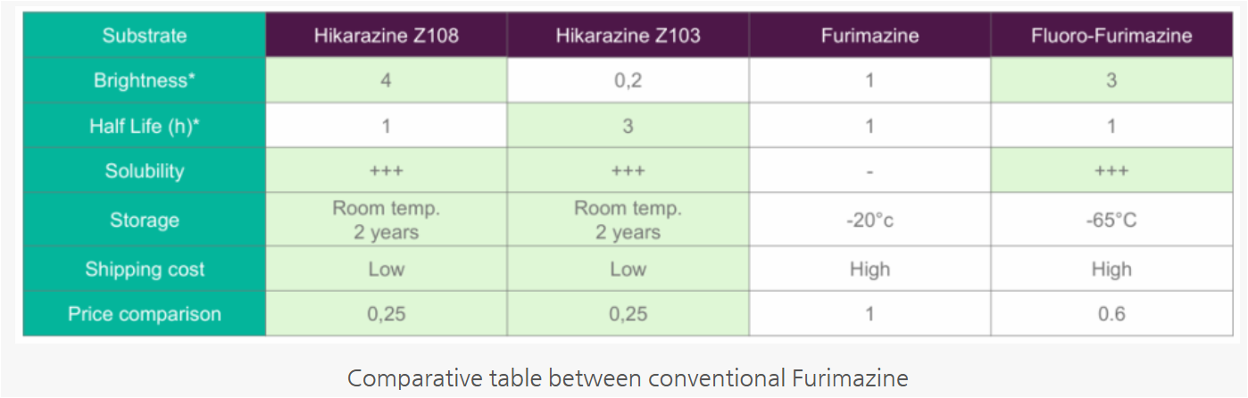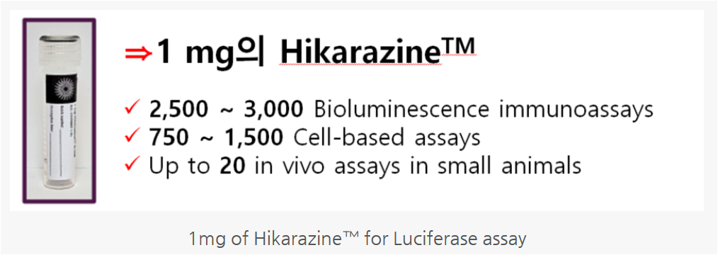 Hikarazine™은 "Luciferase assay"를 위해 프랑스의 파스퇴르 연구소와 CNRS의 연구자들이 참여하여 특별히 설계된 특허의 루시페린 전구체입니다.